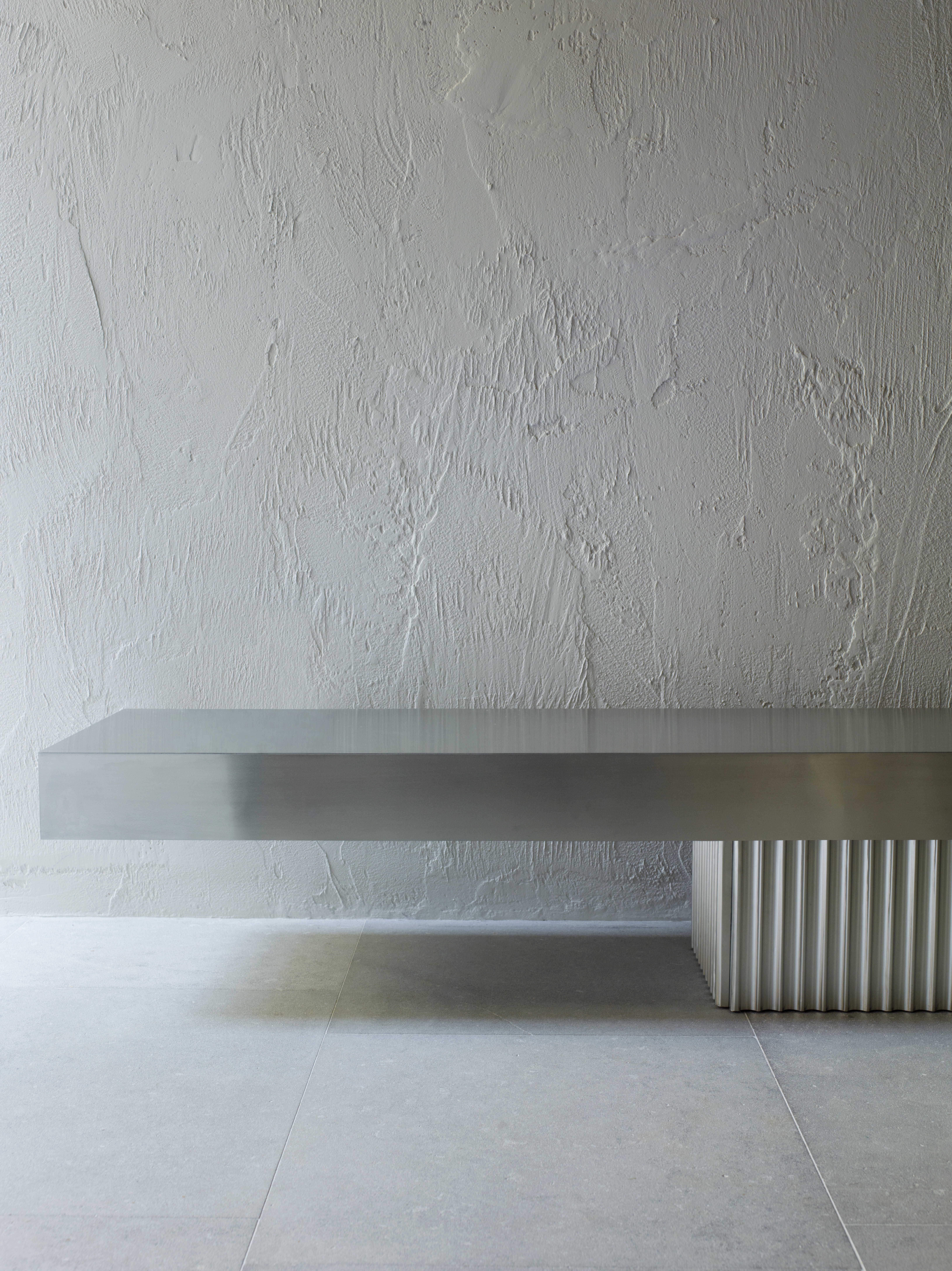 Hammered Aluminium, fibreboard, leather, foam, magnets.